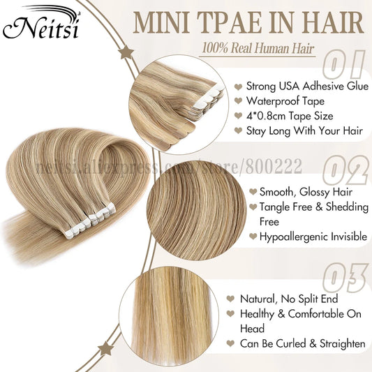Neitsi Ombre Color Mini Tape In Human Hair Adhesive Extensions Straight Skin Weft 100% Natural Real Mega Hair 12" 16" 18" 20"