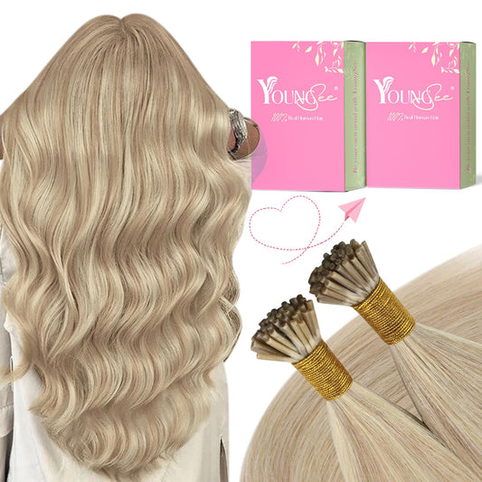 Remy Flat Tip Hair Extensions Human Hair Keratin Fusion Hair Extensions Real Human Hair Extensions for Women 50G/50S Warm Ash Blonde Highlight Bleach Blonde 16inch