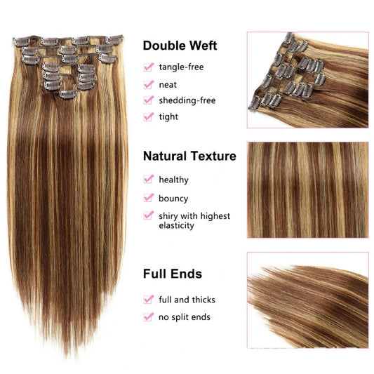 Hair Clip In Hair Extensions Real Human Hair for Women Highlights Chocolate Straight Hair 7pcs Clip In Human Hair for Women