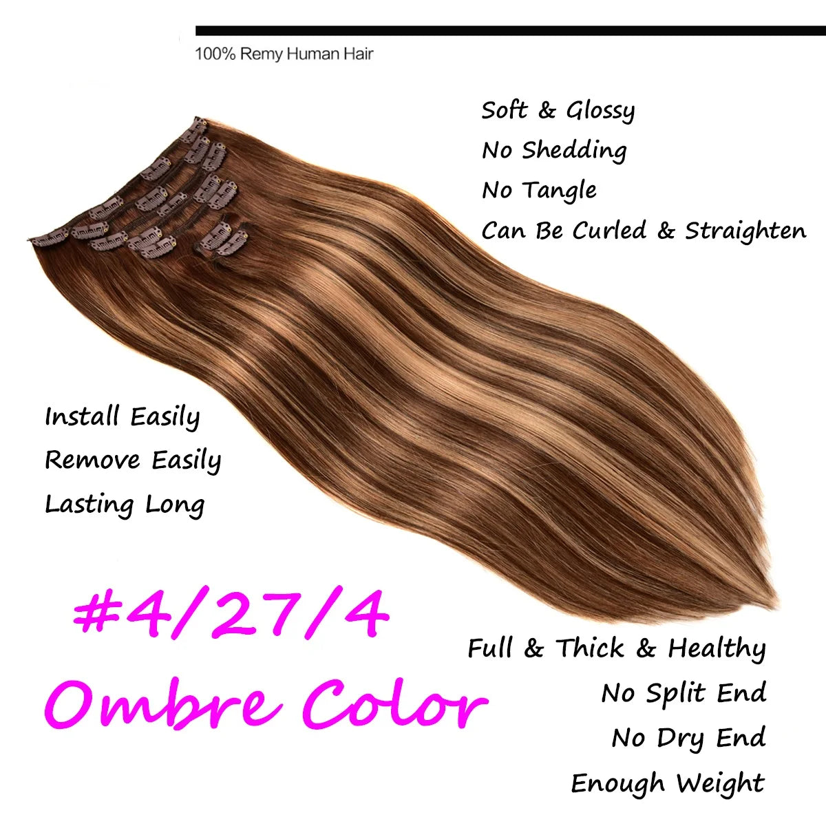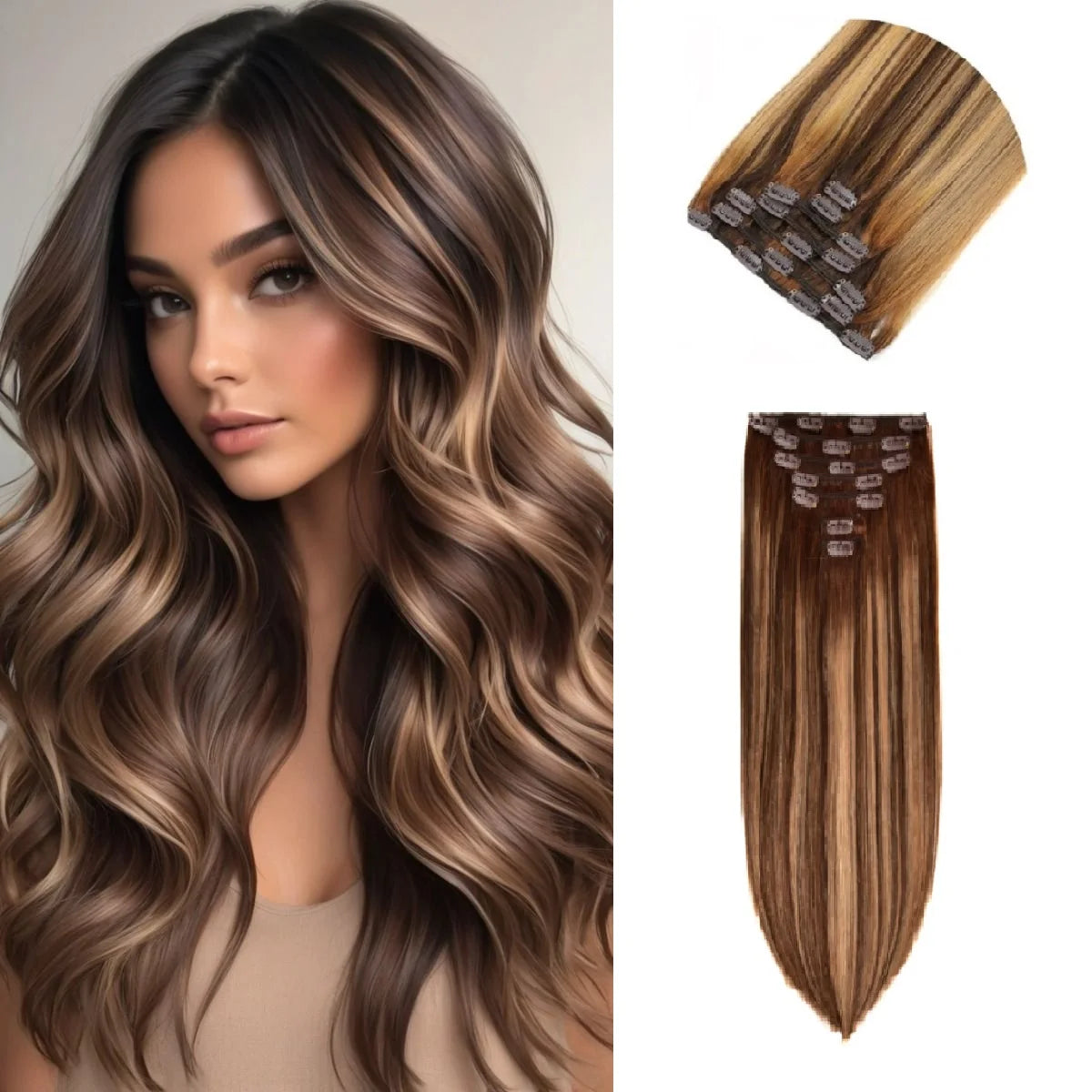 Real Human Clip in Hair Extensions Ormbre Human Hair Balayage Chocolate Brown to Caramel Blonde Clip Ins hair Extensions