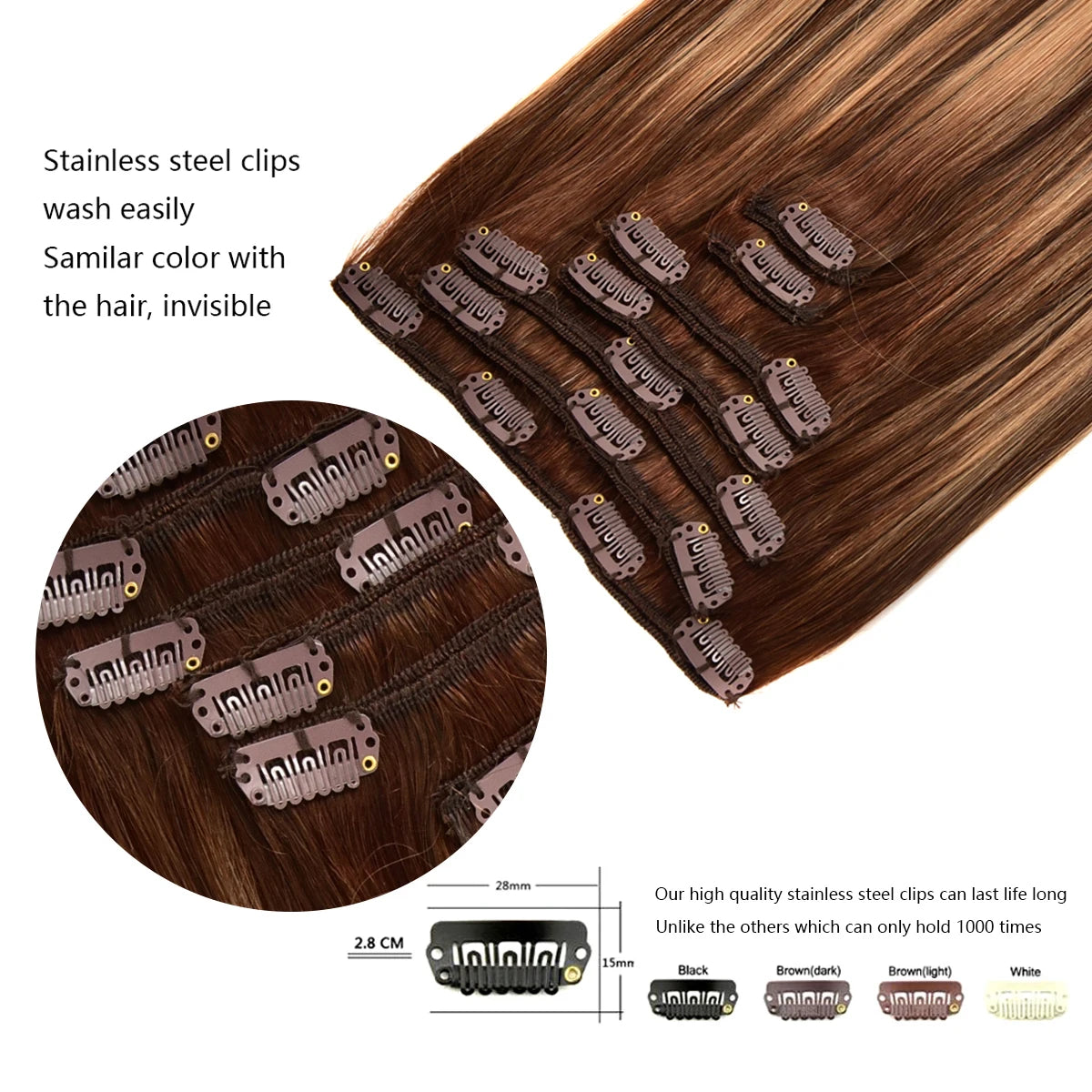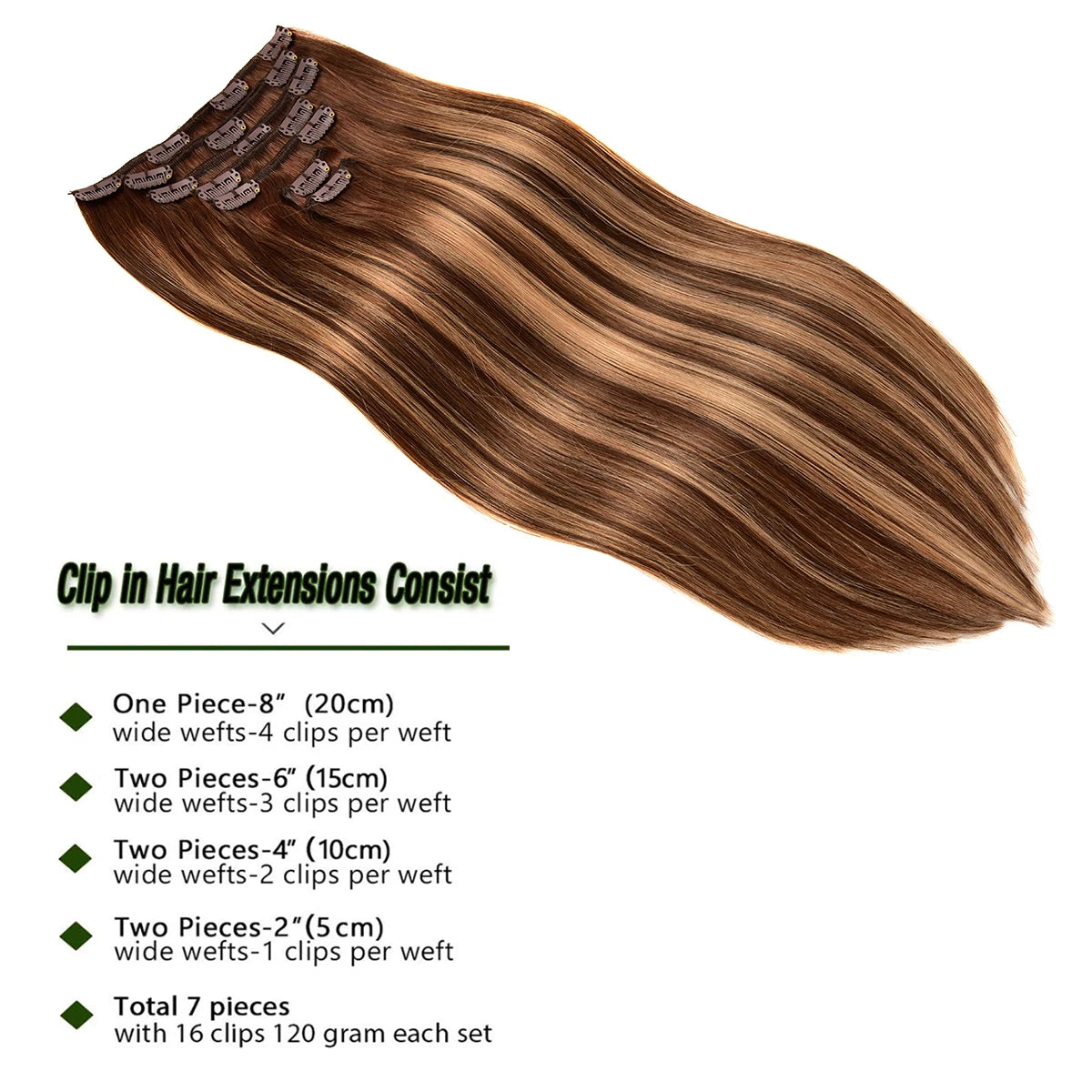 【Clip in Hair Extensions Specification】- This clip in human hair extensions, 7 pieces 120g with 16 clips per set. 105g net weight without clips, 120g with clips. Just to thicken your hair, suggest 1-2 sets; for a full head, suggest 2-3 sets; if you want to add length and volume, we recommend 2-3 sets.