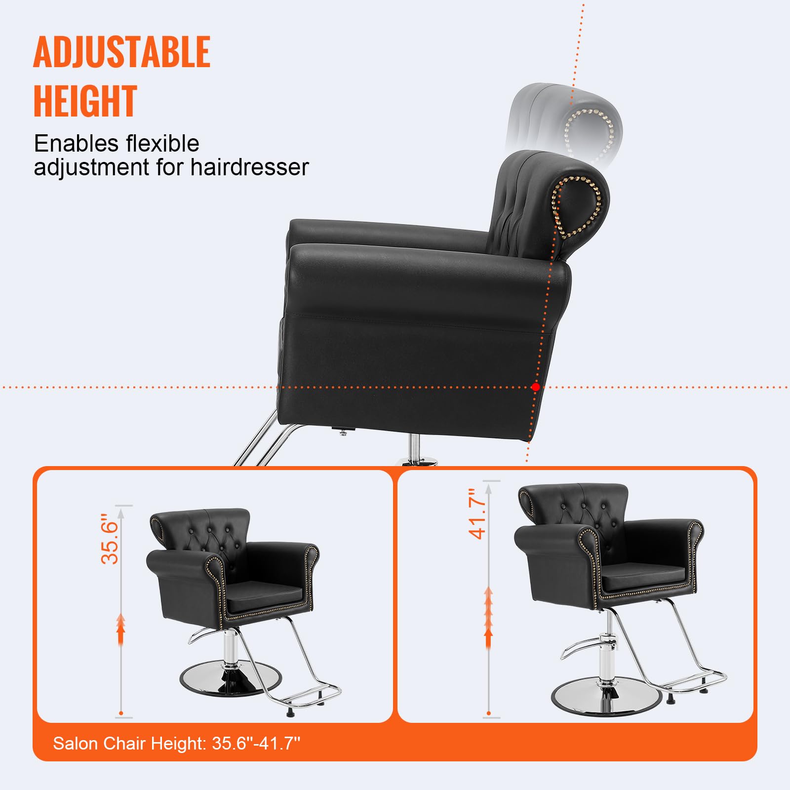 - Easy Adjustments: The barber chair's height can be adjusted from 35.6'' to 41.7'' (905-1060 mm) by pressing the hydraulic pump lever with your foot. 360° swivel function makes it convenient for hairstylists and beauticians to work.